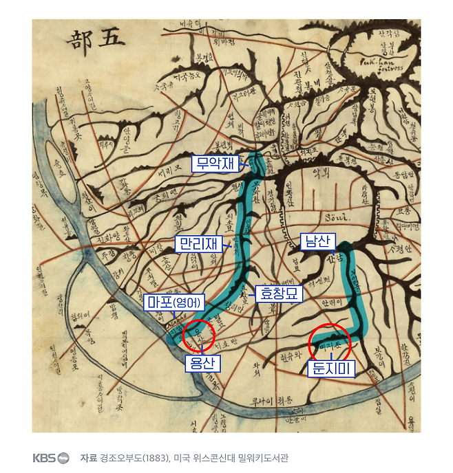 이 지역의 지명이 원래 둔지미였다는 사실은 여러 고지도와 문헌에서도 쉽게 확인됩니다. 미국 위스콘신대 밀워키 도서관이 소장하고 있는 한글 지도 '경조오부도'가 대표적입니다.