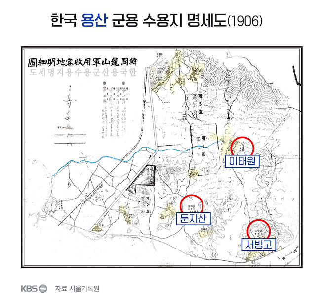 그런데 1906년 제작된 '한국 용산 군용 수용지 명세도'를 보면, 남산 아래 이태원과 둔지산, 서빙고 일대를 수용하면서 지도 명칭을 '용산'이라고 표기했습니다. 실제 용산이 위치한 지도 서쪽은 지도상에 표시하지 않았습니다.