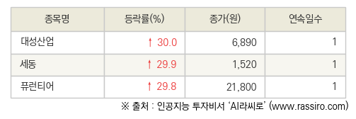 [fnRASSI]오늘의 상한가, 대성산업 30.0% ↑