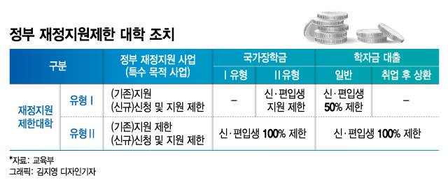 재정지원 제한대학은 정부 재정지원 사업에서 제한되고 국가장학금, 학자금 대출 혜택도 받지 못한다. 가령 Ⅱ유형으로 지정된 대학에는 국가장학금과 학자금대출이 100% 제한된다. 해당 조치는 2023학년도 1년 동안 적용한다.