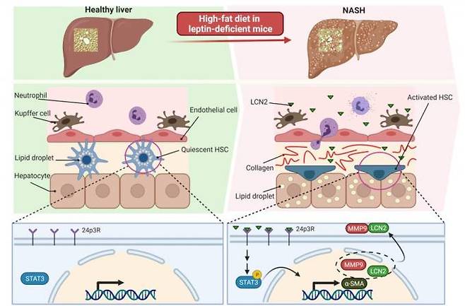 논문 제목은 리포칼린-2가 간별세포를 활성화해 고지방식이를 먹인 비만 마우스에서 비알코올지방간염을 촉진한다.(Lipocalin-2 activates hepatic stellate cells and promotes non-alcoholic steatohepatitis in high-fat diet-fed ob/ob mice).