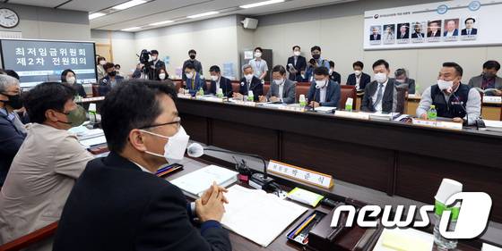 (세종=뉴스1) 김기남 기자 = 이동호 위원(오른쪽)이 17일 오후 정부세종청사 고용노동부에서 열린 최저임금위원회 제2차 전원회의에서 회의 시작 전 모두 발언을 하고 있다. 2022.5.17/뉴스1