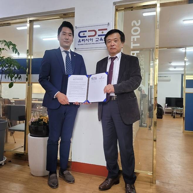 [부산=뉴시스] 부산 유라시아교육원은 17일 유라시아권 전문법률사무소 KL(KORUS LAW)과 법률지원 공익사업을 위한 업무협약서를 체결했다. 양 기관은 법정 통 번역사, 외국어 번역 행정사 양성 등 북방과 남방 지역에서 와서 부산에 거주하는 학생, 노동자, 결혼이민자 등 유라시아 권 외국인들의 법률지원을 위한 공동지원 사업을 펼치기로 합의했다. (사진 왼쪽부터) 고민석 KL 대표변호사, 이재혁 유라시아교육원 대표. (사진=유라시아 교육원 제공)