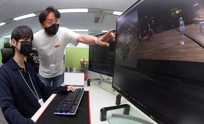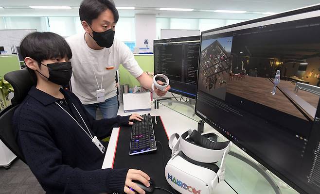 한글과컴퓨터가 메타버스와 인공위성을 중심으로 새 활로 찾기에 속도를 낸다. 17일 경기도 성남시 한컴프론티스에서 개발자들이 새로운 메타버스 플랫폼 개발에 매진하고 있다.