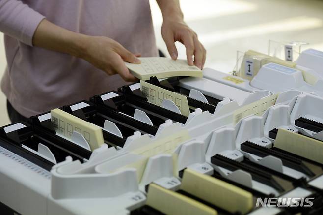 [서울=뉴시스] 이영환 기자 = 제8회 전국동시지방선거를 보름 앞둔 17일 오후 서울 송파구선거관리위원회 임시사무소에서 열린 투표지분류기 교육에 참가한 운영요원들이 교육을 받고 있다. (공동취재사진) 2022.05.17. photo@newsis.com