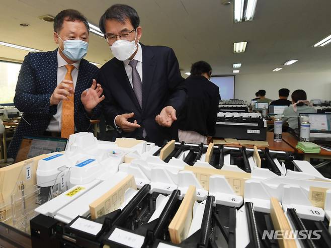 [서울=뉴시스] 이영환 기자 = 노태악(오른쪽) 신임 중앙선거관리위원장이 제8회 전국동시지방선거를 보름 앞둔 17일 오후 서울 송파구선거관리위원회 임시사무소에서 열린 투표지분류기 교육 현장을 찾아 조태성 송파구선관위 사무국장과 현장 점검을 하고 있다. (공동취재사진) 2022.05.17. photo@newsis.com