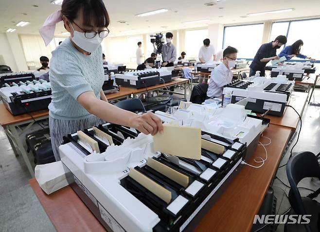 [서울=뉴시스] 이영환 기자 = 제8회 전국동시지방선거를 보름 앞둔 17일 오후 서울 송파구선거관리위원회 임시사무소에서 열린 투표지분류기 교육에 참가한 운영요원들이 교육을 받고 있다. (공동취재사진) 2022.05.17. photo@newsis.com