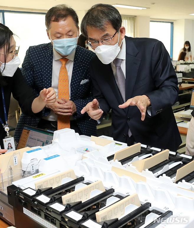 [서울=뉴시스] 이영환 기자 = 노태악(오른쪽) 신임 중앙선거관리위원장이 제8회 전국동시지방선거를 보름 앞둔 17일 오후 서울 송파구선거관리위원회 임시사무소에서 열린 투표지분류기 교육 현장을 찾아 조태성 송파구선관위 사무국장과 현장 점검을 하고 있다. (공동취재사진) 2022.05.17. photo@newsis.com