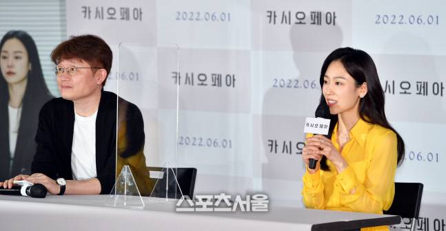 배우 서현진이 17일 열린 영화 ‘카시오페아’ 시사회에서 기자 인터뷰를 위해 무대에 올라 기자들의 질문에 답하고 있다. 영화 카시오페아는 치매 환자와 가족에 대한 이야기다. 2022.05.17.