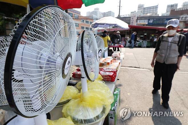 (서울=연합뉴스) 신현우 수습기자 = 서울 낮 기온이 27도까지 오르며 초여름 날씨를 보인 17일 오후 서울 종로구 동묘시장에서 한 시민이 선풍기를 구경하고 있다. 2022.5.17