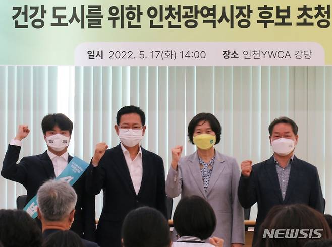 [인천=뉴시스] 김동영 기자 = 17일 오후 인천 남동구 구월동 인천YWCA 대강당에서 열린 인천공공의료포럼 인천시장 후보자 초청 보건의료정책 토론회에 참석한 (왼쪽부터) 기본소득당 김한별 후보, 더불어민주당 박남춘 후보, 정의당 이정미 후보, 국민의힘 유정복 후보가 기념촬영을 하고 있다. 2022.05.17. dy0121@newsis.com