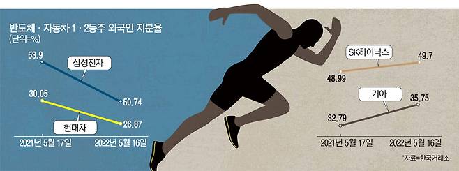자동차 업종 1·2등 종목인 현대차와 기아의 경우도 비슷하다. 전날 기준 현대차의 외국인 지분율은 26.87%로 1년 전(30.05%)보다 3.18%포인트 줄었다. 기아의 외국인 지분율이 이 기간(32.79%→35.75%) 3%포인트 가까이 늘어난 것과 대조된다. 외국인 투자자는 같은 기간 현대차를 1조4595억원 순매도한 반면 기아를 1조1399억원어치 사들였다.