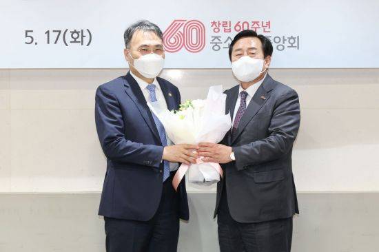 [아시아경제(대전) 정일웅 기자] 조달청은 17일 이종욱 청장이 중소기업중앙회를 방문해 중소기업 지원방안을 논의했다고 밝혔다. 이날 방문은 이 청장이 취임한 후 현장을 찾은 첫 행보다. 조달청과 중기중앙회는 2019년 중소·벤처기업의 공공판로 지원을 위한 업무협약을 체결하는 등 긴밀한 협력관계를 유지하고 있다. 이 청장(왼쪽)과 중기중앙회 김기문 회장(오른쪽)이 기념촬영을 하고 있다. 조달청 제공