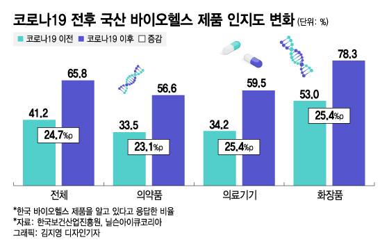 17일 한국보건산업진흥원의 인지도 조사에 따르면 해외 소비자 가운데 한국 바이오헬스 제품을 알고있는 소비자는 65.8%로 코로나19 이전 41.2%에 대비 24.2%포인트 상승했다. 세부 분야별로도 상대적으로 인지도가 높았던 화장품(53.0%→78.3%)은 물론, 의약품(33.5%→56.6%)과 의료기기(34.2%→59.5%)까지 고른 영역의 성장이 돋보였다.