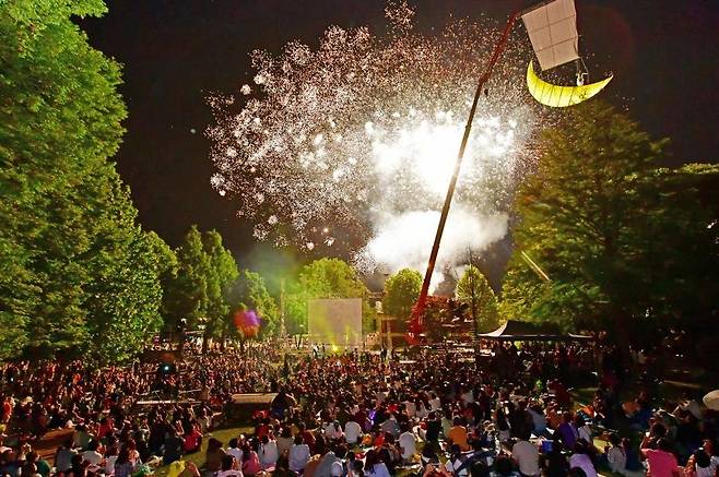 코로나19 이후 3년 만에 개최되는 수원연극축제는 나무숲이 우거진 권선구 경기상상캠퍼스와 수원탑동시민농장에서 연극뿐만 아니라 거리극, 무용, 신체극, 서커스, 공중퍼포먼스 등 21개의 다채로운 작품을 선보인다. 사진은 2019년 수원연극축제 폐막식 모습. 2022.5.17 [수원시 제공. 재판매 및 DB 금지]