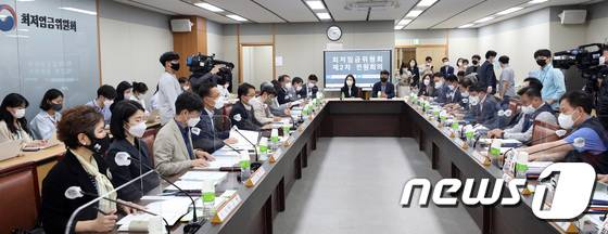 (세종=뉴스1) 김기남 기자 = 박준식 최저임금위원회 위원장이 17일 오후 정부세종청사에서 열린 최저임금위원회 제2차 전원회의에서 모두 발언을 하고 있다. 2022.5.17/뉴스1