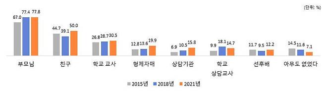 부모님과 의논하였다는 응답이 77.8%로 가장 많았고, 다음으로 친구(50%), 학교 교사(30.5%), 형제자매, 상담기관, 학교 상담교사 순이었습니다.