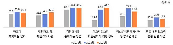 2015년, 2018년 학교를 그만둘 당시 학교에서 가장 많이 받은 정보는 검정고시 준비방법이었으나, 2021년 가장 많이 받은 정보는 학교밖청소년지원센터에 대한 정보(41.8%)로 2015년 15.6%에 비해 큰 폭으로 증가하였습니다.