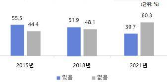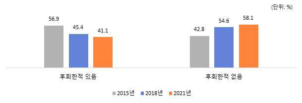 - 학교 밖 청소년의 58.1%는 학교를 그만둔 것을 후회한 적이 없다고 응답하였으며, 2015년 이후 그 비율이 지속적으로 증가하고 있음