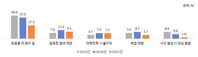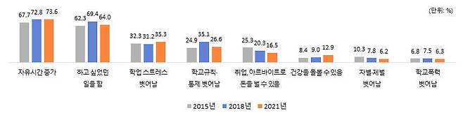2015년, 2018년, 2021년 조사에서 공통적으로 건강검진 제공, 진학정보 제공, 검정고시 준비 지원, 진로탐색을 위한 체험 등에 대한 수요가 높았으나, 체육활동 지원 및 근로 중 피해에 대한 보호 정책 수요는 감소폭이 컸다. 이는 새로운 정책 항목들이 포함되면서 순위가 내려간 것으로 보입니다.