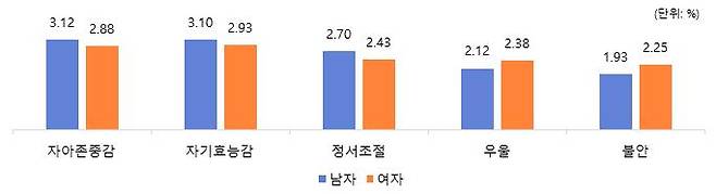 학교 밖 청소년의 자아존중감은 3.00점, 자기효능감은 3.01점으로 대체로 긍정적이었고, 우울감은 2.25점, 불안감은 2.09점으로 2018년에 비해 다소 낮아진 것으로 나타났습니다.