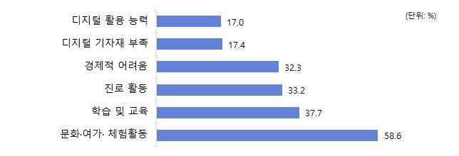 코로나19의 확산으로 학교 밖 청소년은 전체적으로 문화·여가·체험 활동과 학습 및 교육에서 어려움을 겪었다는 응답이 많았습니다.