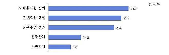전체적으로 변화가 없다는 응답이 절반이 넘었으나, 사회에 대한 신뢰, 전반적인 생활, 진로·취업 전망은 부정적인 변화 응답이 많았으며, 친구관계와 가족관계는 부정적인 변화 응답이 적었습니다.