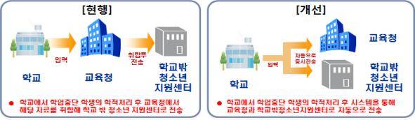 학교를 그만 둔 청소년들이 학교밖청소년지원센터로 신속하게 연계되어 지원을 받을 수 있도록 사전동의 절차 없이도 정보를 연계할 수 있는 대상을 고등학교까지 확대하고 교육부 4세대 나이스시스템과 연계하여 학업중단 정보 전송 시스템 구축을 추진합니다.