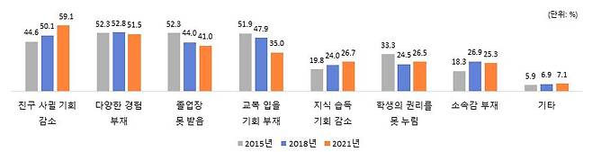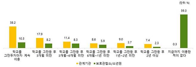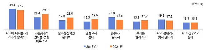 학교를 그만둔 이유로 가장 많이 꼽힌 것은 학교에 다니는 것이 의미가 없었기 때문(37.2%)이었으며, 2018년 조사에 비해 다른 곳에서 원하는 것을 배우기 위해 학교를 그만두는 비율(29.6%)은 증가(6.2%p)하였고, 공부하기 싫거나 학교분위기, 친구와의 문제 등으로 인해 학교를 그만두는 비율은 감소하였습니다.