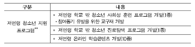 학교 밖 청소년 지원 서비스의 접근성을 강화하기 위해 확장 가상 세계(메타버스) 기반 ‘꿈드림월드’ 공간(플랫폼)* 구축 학교밖청소년지원센터 인력 증원 저연령용 온라인학습 프로그램 및 콘텐츠** 개발을 추진합니다.