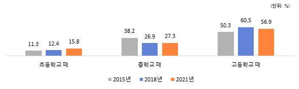 2018년 조사에 비해 고등학교 시기에 학교를 그만두는 비율이 3.6%p 낮아진 반면, 중학교 시기에 학교를 그만두는 비율은 0.4%p, 초등학교 시기에 그만두는 비율은 3.4%p 높아진 것으로 조사되었습니다.