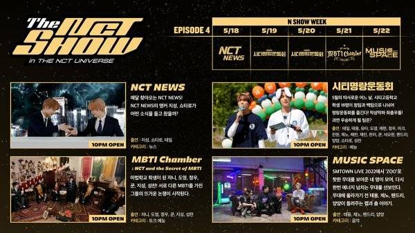 또한, 21일 예능 토크쇼 ‘MBTI Chamber : NCT and the Secret of MBTI’(엠비티아이 챔버 : 엔시티 앤드 더 시크릿 오브 엠비티아이)에는 쟈니, 쿤, 도영, 정우, 성찬, 지성이 출연, 서로 다른 MBTI를 가진 멤버들이 주어진 주제에 대해 열띤 토론을 펼쳐 공감과 웃음을 자아낼 전망이다.
