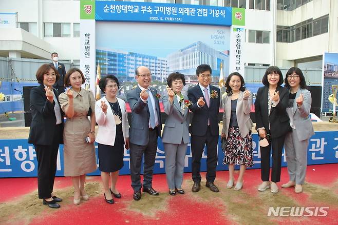 [구미=뉴시스] 박홍식 기자 = 정일권(왼쪽 네번째) 순천향대학교 부속 구미병원장이 17일 오후 외래관 건립 기공식을 마친 뒤 병원 관계자들과 기념사진을 찍고 있다. 2022.05.17 phs6431@newsis.com
