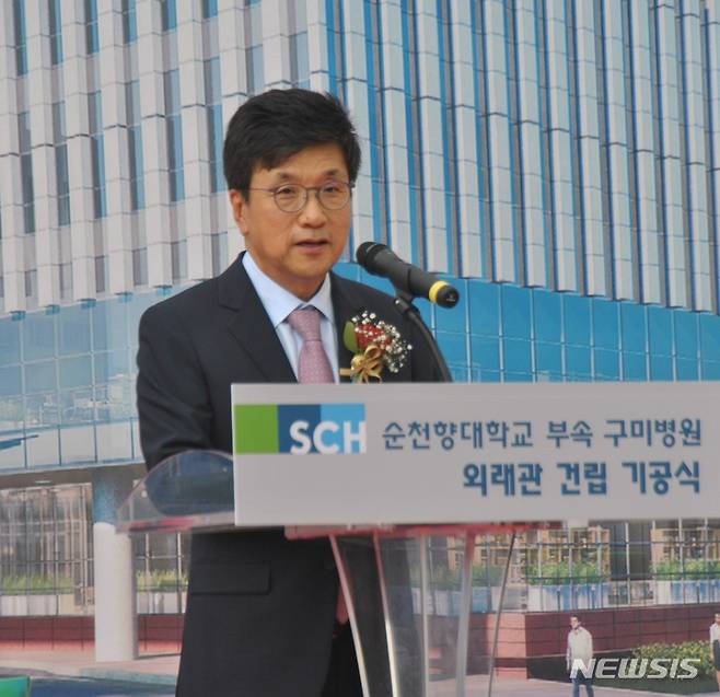 순천향대 구미병원 외래관 건립 기공식..기념사하는 서교일 이사장