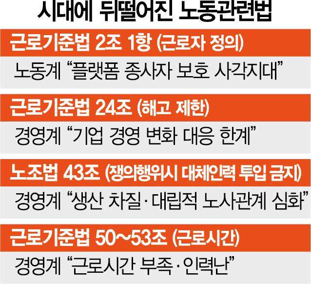 플랫폼 관련 법제 미비는 한국의 노동법이 처한 현실을 보여주는 하나의 사례일 뿐이다. 국내 노동법은 1953년 제정된 후 큰 틀에서 한 번도 바뀌지 않았다. 경영계는 물론 노동계에서도 최근 산업 대전환 시대의 고용·노동·노사 관계를 제대로 반영하지 못하고 있다는 지적이 끊이지 않는다.