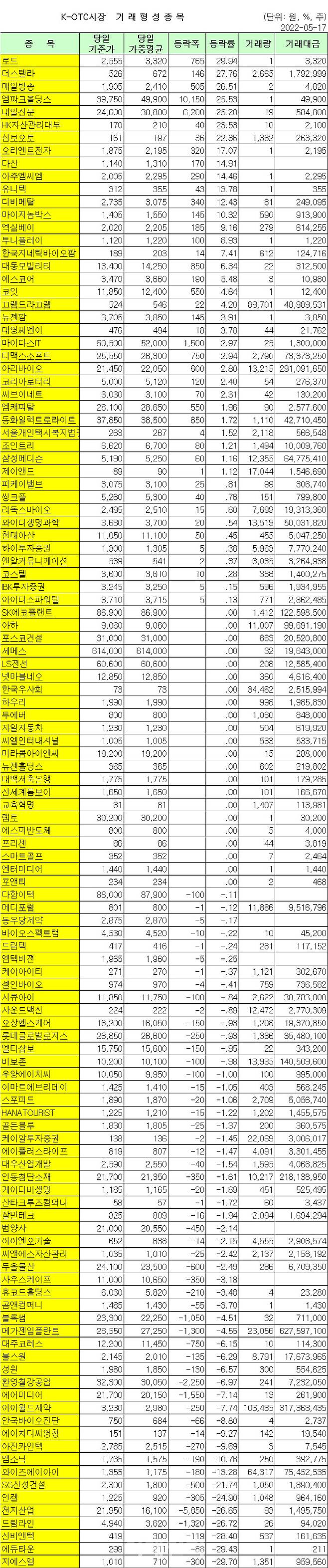 [이데일리 유준하 기자] 다음은 5월17일 K-OTC 시장 거래 현황이다.