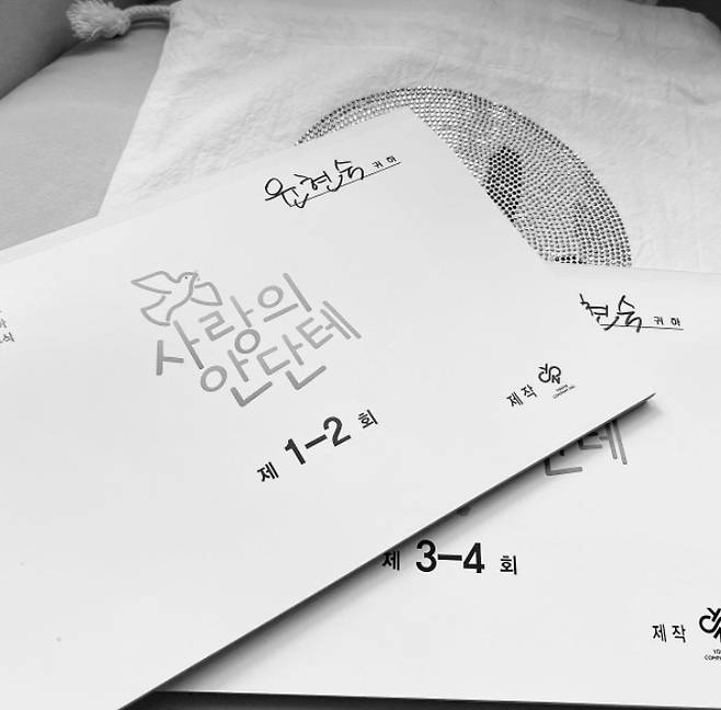 사진에는 드라마 '사랑의 안단테'의 대본이 담겼다. '사랑의 안단테'는 판타지 로맨스 코미디 드라마로 한국전쟁 이후 70년 만에 남한과 북한이 종전 선언을 하게 된 후, 남과 북이 강원도 고성 DMZ에 평화마을 프로젝트를 실행하는 내용을 담는다. 임슬옹과 황승언이 주연으로 출연을 확정지은 상태다.