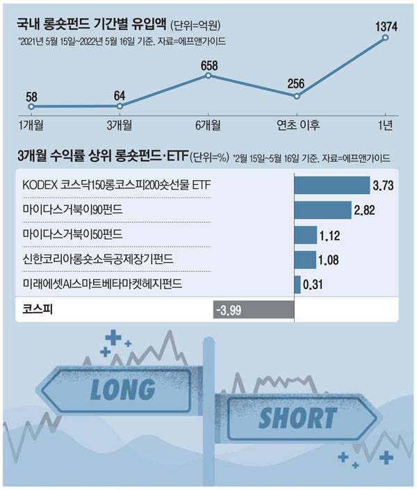 17일 금융정보 제공 업체 에프앤가이드에 따르면 국내 46개 롱숏펀드는 지난 3개월 동안 0.01%의 수익률을 기록했다. 크게 높은 수익률은 아니지만, 약세장에서 선방하는 모습이다. 실제 이 기간에 코스피는 3.99% 하락했다. 국내 주식형 펀드 평균 수익률(-2.43%)이나 국내 주식형 상장지수펀드(ETF)의 평균 수익률(-3.47%)과 비교해도 성과가 나쁘지 않다.