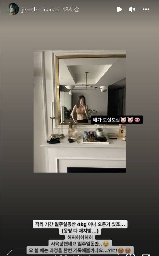 김지우는 16일 자신의 인스타그램 스토리를 통해 '격리 기간 일주일 동안 4kg이나 오른 거 있죠(몽땅 다 체지방) 허허허허 사육당했네요. 일주일 동안..요 살 빼는 과정을 한 번 기록해볼까나요? 배가 토실토실'이라는 글을 올렸다.