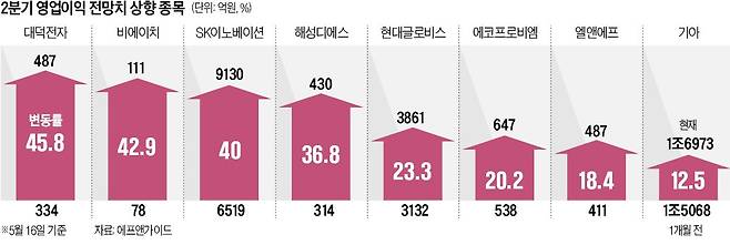 에프앤가이드에 따르면 주요 배터리 관련주 중에서 SK이노베이션, 에코프로비엠, 엘앤에프의 2분기 영업이익 전망치가 빠르게 상향 조정되고 있다. SK이노베이션은 16일 기준 연고점 대비 주가가 30% 하락했다. 증권사들이 제시한 2분기 영업이익 전망치는 빠르게 올라가고 있다. 1개월 전 6519억원에서 최근 9130억원으로 실적 전망치가 40%나 상향 조정됐다. 최근 국제 유가 및 정제마진이 급등하면서 본업인 정유 사업의 실적이 큰 폭으로 좋아지고 있기 때문이다. 조현렬 삼성증권 연구원은 “흑자 전환이 미뤄져온 배터리사업의 수익성은 하반기부터 의미 있는 변화가 나타날 것”이라고 설명했다.