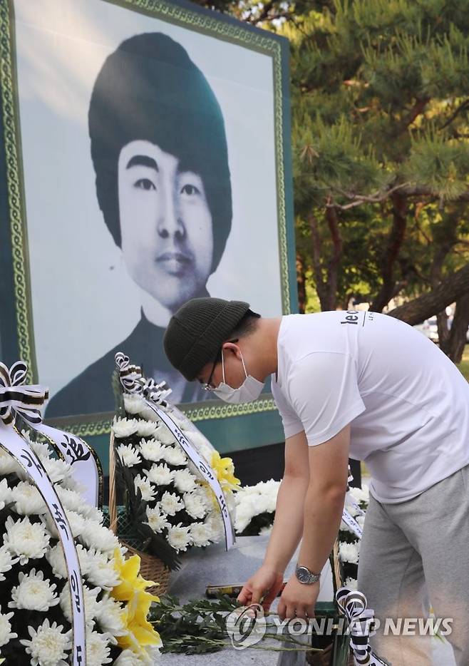 (전주=연합뉴스) 나보배 기자 = 17일 제42주년 5·18 민중항쟁 전북기념식 및 이세종 열사 추모식이 열린 전북 전주시 전북대학교에서 학생들이 헌화하고 있다. 2022.5.17