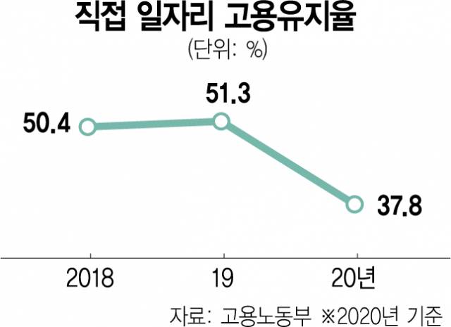더구나 고용 유지율은 2019년 51.3%에서 2020년 37.8%로 크게 떨어졌다. 고용 유지율은 직접 일자리 사업 참여자 중 사업에 참여한 지 6개월 이내에 민간으로 취업해 6개월 이상 일한 근로자의 비율이다. 고용 유지율이 급락한 것은 코로나19로 인한 경영난으로 기업이 일자리를 유지하지 못했기 때문이라는 해석이 나온다. 동시에 일자리 사업을 통해 취업자에게 일차적인 일 경험을 제공하고 더 나은 일자리로 옮아가는 식의 지원 사업 원리가 제대로 작동하지 못했다는 분석도 가능하다.