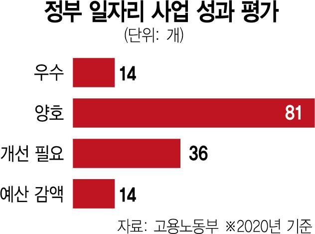 고용노동부의 ‘2020년 재정 지원 일자리 사업 평가 및 개선 방안’에 따르면 24개 부처의 일자리 사업 145개 가운데 우수 등급은 14개, 양호는 81개, 개선 필요는 36개, 예산 감액은 14개로 나타났다. 2020년에만 33조 6000억 원이 투입된 재정 일자리 사업 10곳 중 3곳은 개선이나 예산 감액이 필요하다는 지적을 받은 셈이다.