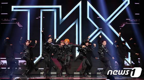 (서울=뉴스1) 김진환 기자 = 보이그룹 TNX(티엔엑스, The New Six)가 17일 오후 서울 용산구 한남동 블루스퀘어에서 열린 첫 번째 미니앨범 ‘WAY UP’ 발매 기념 쇼케이스에서 열정적인 무대를 펼치고 있다. 2022.5.17/뉴스1