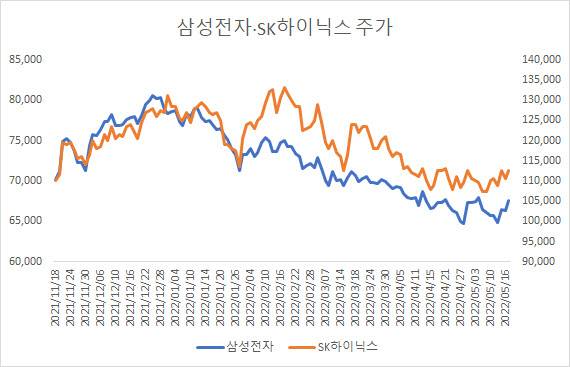최근 한 달 동안 삼성전자는 6만6000원선 안팎을 오가며 박스권 장세를 보였다. 종가 기준 삼성전자가 6만7000원을 넘긴 것은 지난 4일 이후 8거래일 만이다. 지난달 28일에는 6만4500원까지 떨어졌다. 중국 봉쇄와 인플레이션, 러시아-우크라이나 전쟁 등 거시 경제 악조건이 겹쳐 반도체 수요가 둔화할 것이라는 우려에서다.