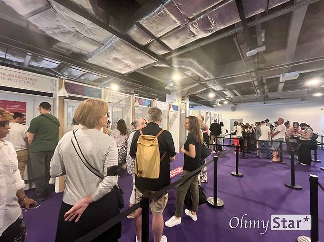 칸영화제를 찾는 게스트와 취재진들이 배지를 수령하는 곳도 북적북적하다. 코로나19 팬데믹으로 전면 온라인으로 진행됐던 2020년이나 날짜를 한참 미뤄 7월에 진행된 2021년 때와 비교하면 열기를 실감할 수 있다. 다만 당일 현장에선 서버 다운이 발생해 배지 수령에 일부 차질이 빚어지기도 했다.