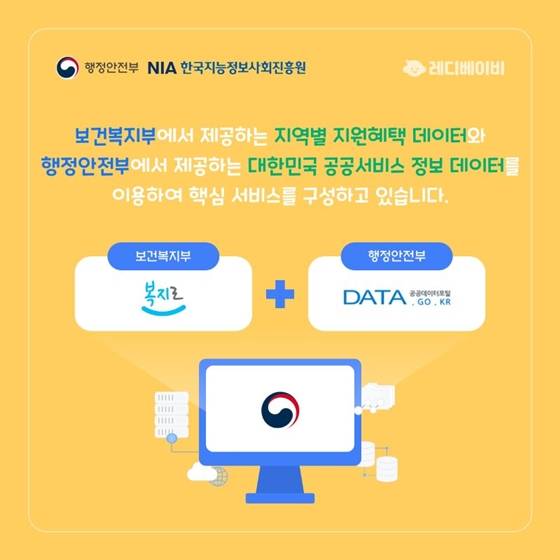 보건복지부에서 제공하는 지역별 지원 혜택 데이터와 행정안전부에서 제공하는 대한민국 공공서비스 정보 데이터를 이용하여 핵심 서비스를 구성하고 있습니다.