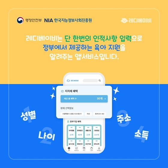 레디베이비는 단 한 번의 인적사항 입력으로 정부에서 제공하는 육아 지원을 알려주는 앱서비스입니다.