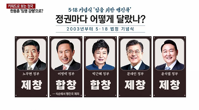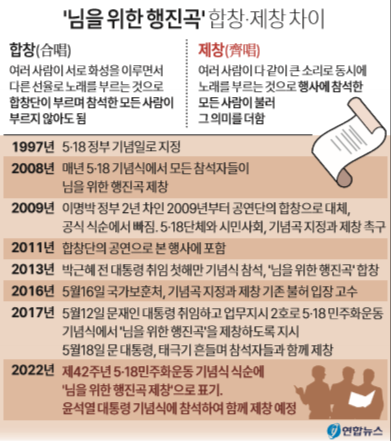 하지만 이명박 정부 출범 2년 차인 2009년 일부 보수진영의 반발로 공식 식순에서 제외되고 식전 행사인 합창단 공연으로 바뀌었는데요, 2010년에는 5·18 단체들과 유족의 반발로 기념식이 둘로 쪼개지며 파행되기도 했죠. 박근혜 정부 때는 합창단의 합창 형태가 내내 유지되다가 문재인 정부가 들어서면서 제창으로 되돌렸고 윤석열 정부가 이를 유지하기로 한 거죠.