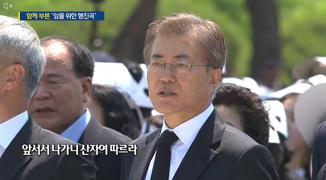 과거 기념식 자료영상을 보면 박근혜 전 대통령은 태극기만 중간중간 흔들고 노래는 부르지 않았고요, 2017년 문재인 정부 첫 5.18 기념식에서 문 대통령은 참가자들과 팔을 흔들며 마음껏 제창해 대비되기도 했죠.